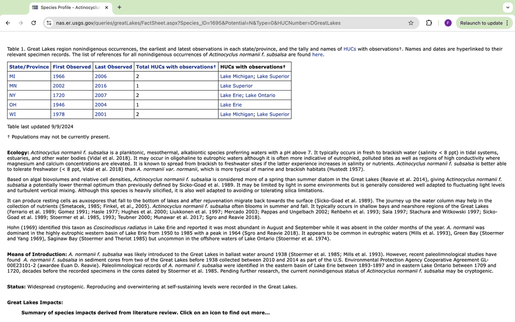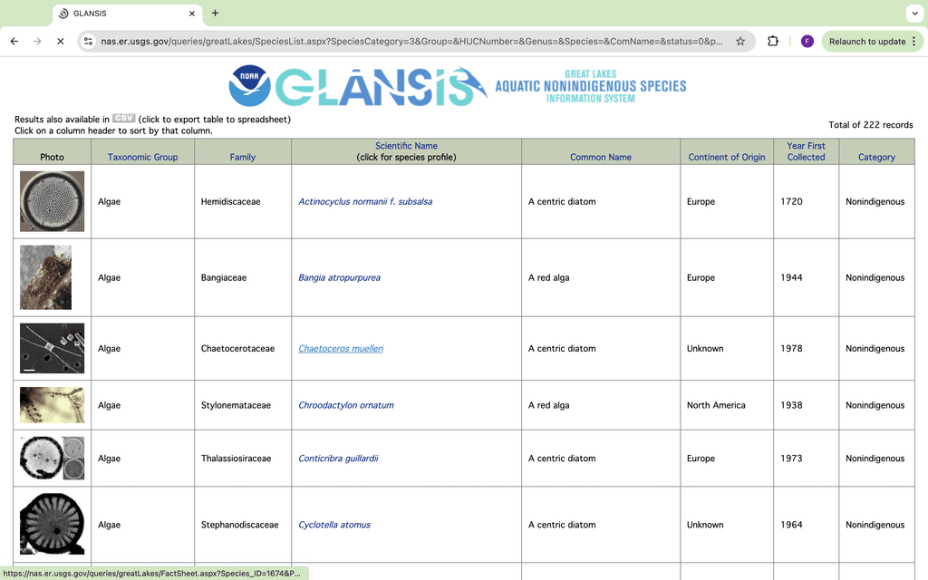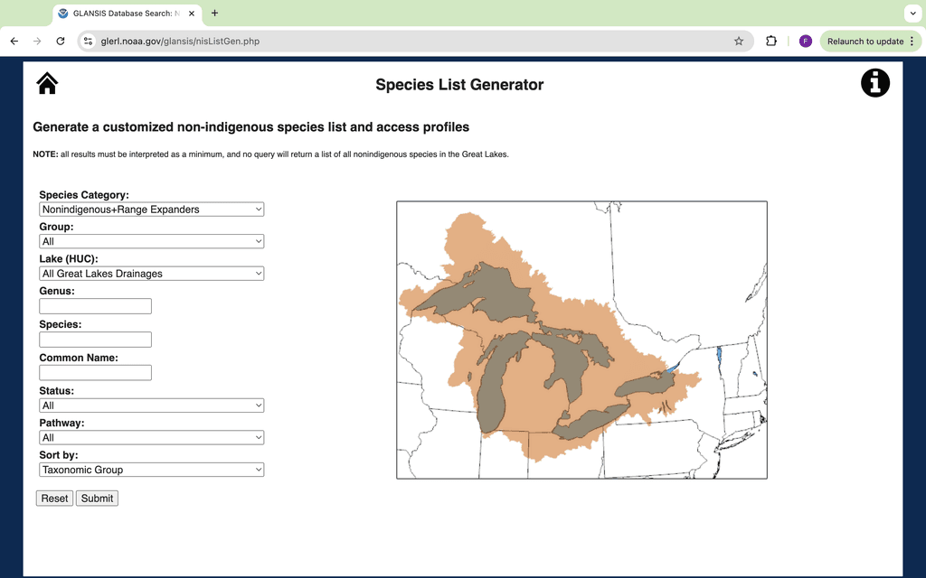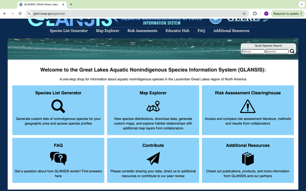 GLANSIS provides dependable information to limit the invasion, spread, and impact of ANS in the Great Lakes. This is realized through a vast collection of tools including species profiles, a specially curated invader list, mapping features, risk assessments, and more. The assistance of Dr. Rochelle Sturtevant, who is the program manager for NOAA's GLANSIS, has been invaluable in procuring feedback from customers who have utilized the website.