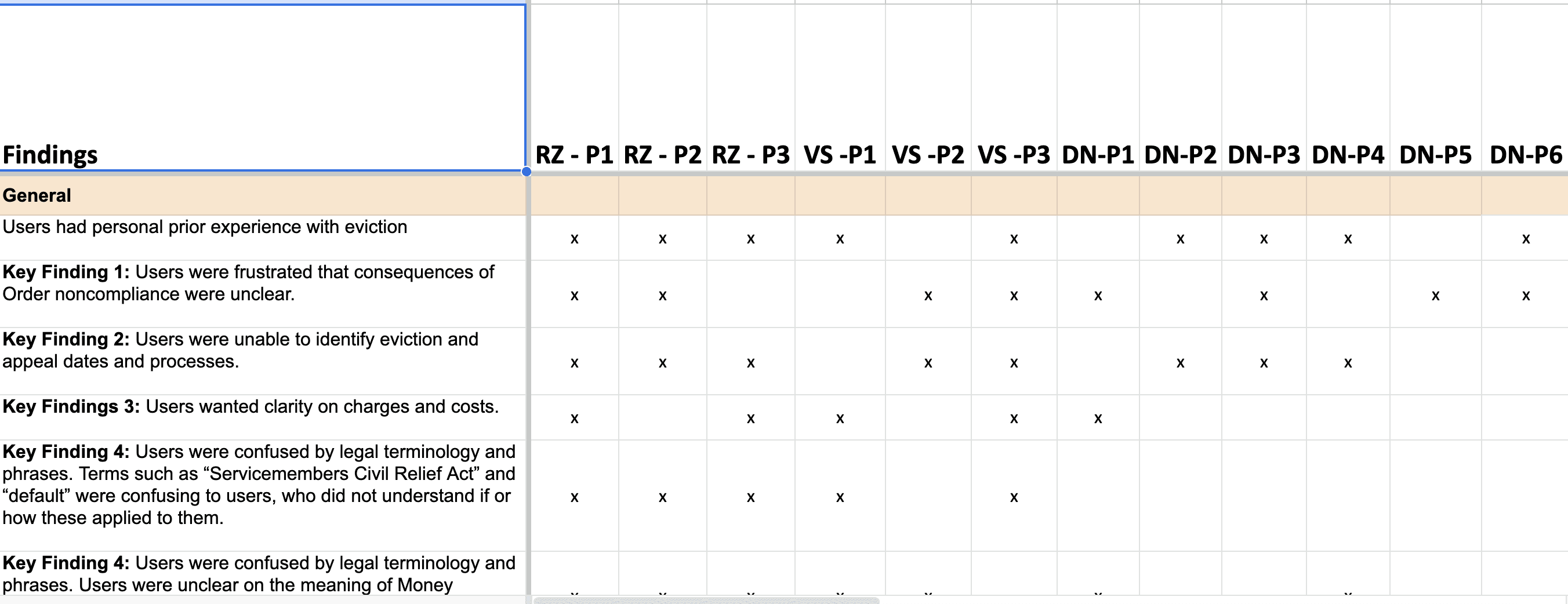 To enhance our analysis, we complemented affinity mapping with Excel to systematically organize and quantify findings. Using Excel, we tracked participants' responses across various themes, such as clarity of legal terminology, understanding of charges, and interpretation of appeal processes.