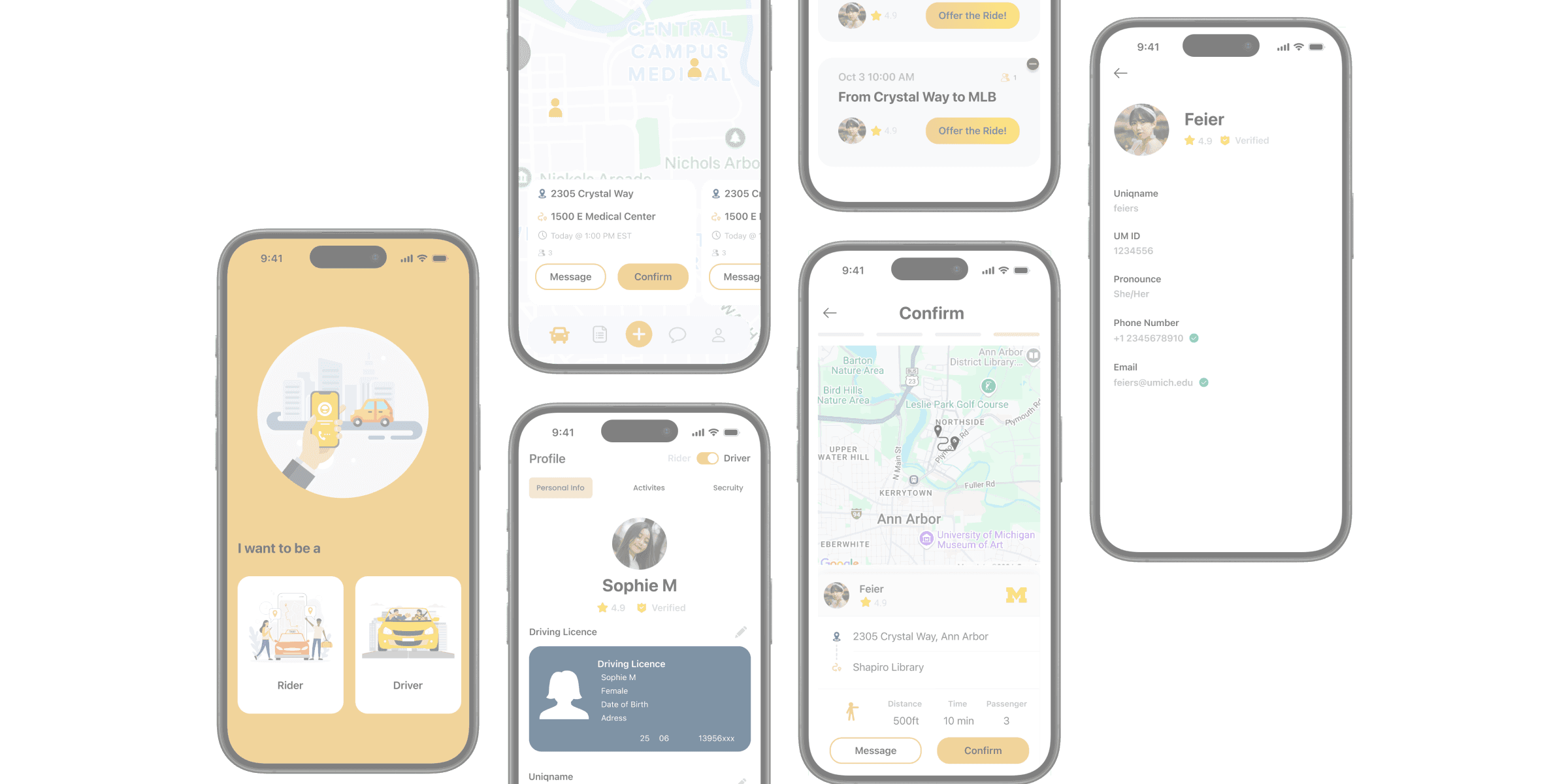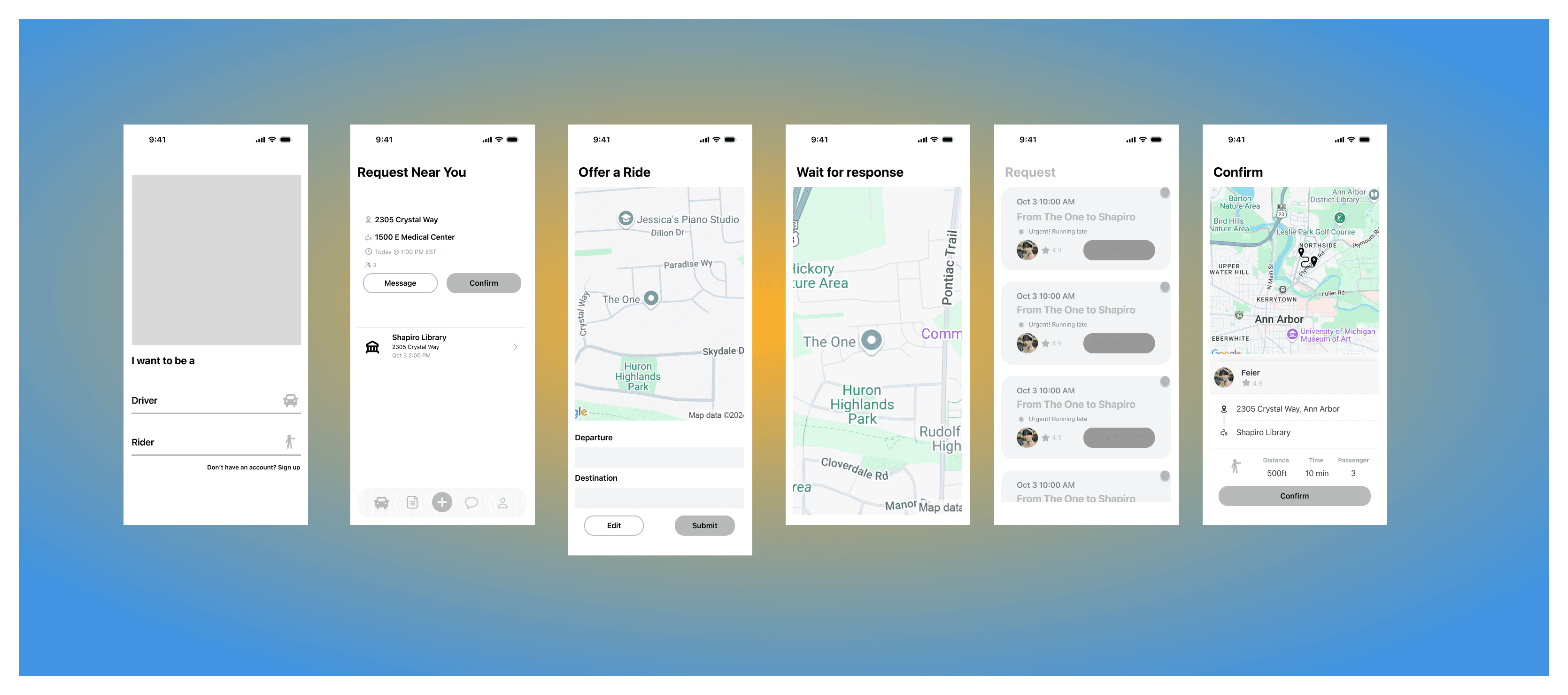 The initial design of WeShare was inspired by familiar rideshare apps like Uber and Lyft. University of Michigan students are already comfortable with these interfaces, so I leveraged this familiarity to create an intuitive experience that saves time and ensures easy navigation.